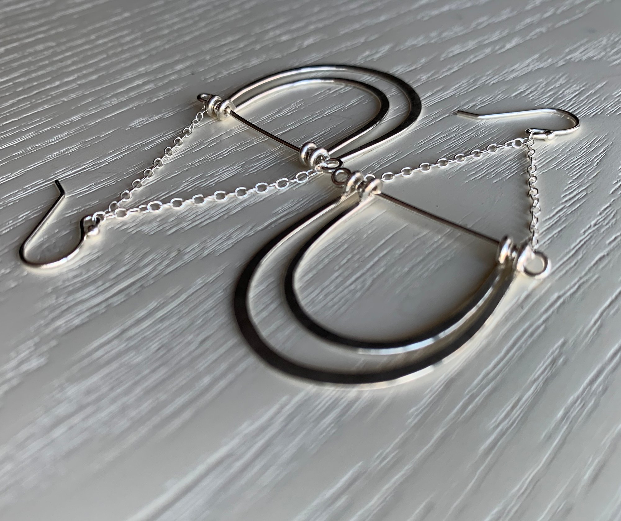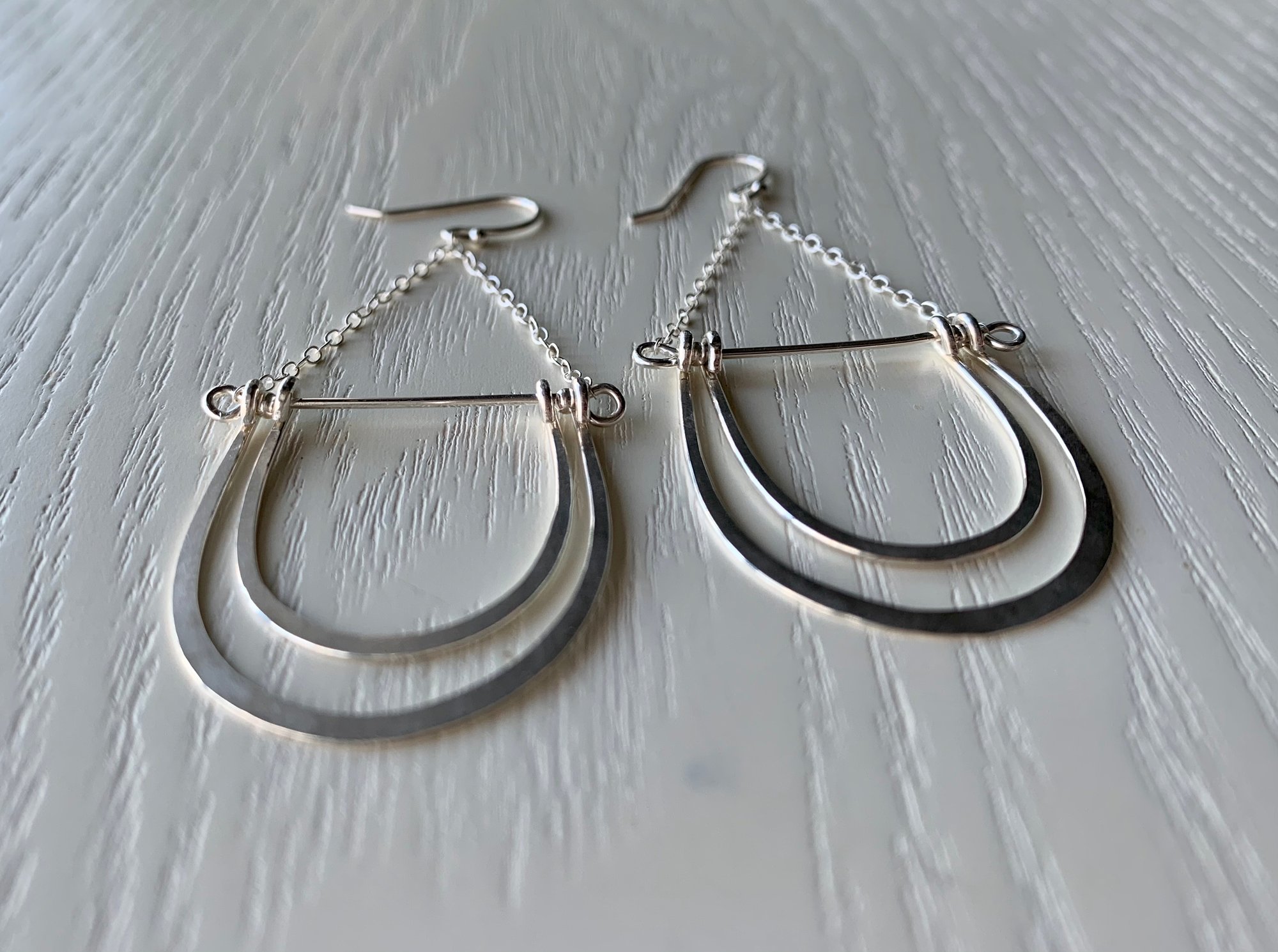Hand hammered, double arch dangle earrings in .925 solid sterling silver. Elegant, playful and perfect for the holidays!