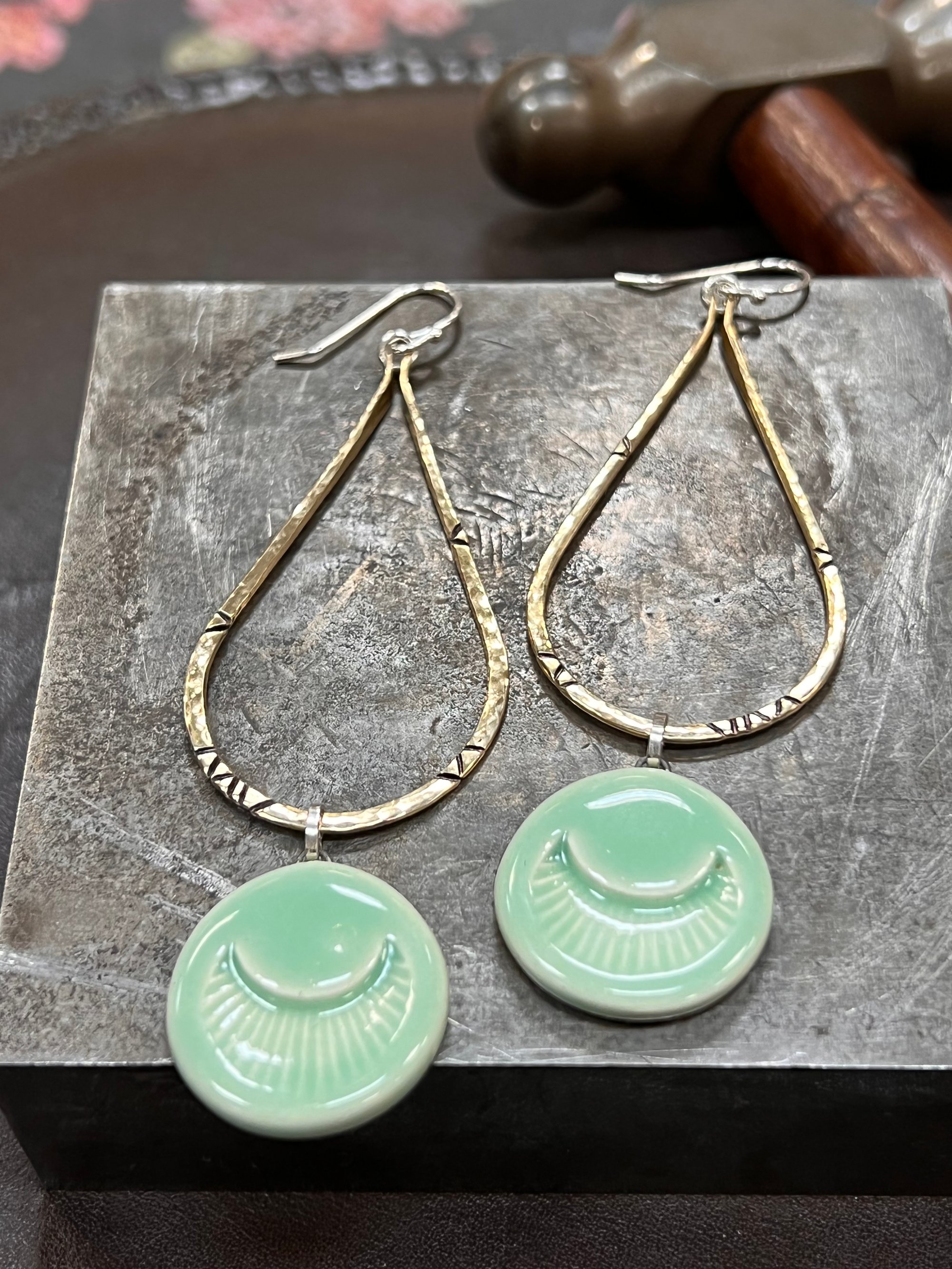 These stunners hang 3" with hammered and textured brass tear drop hoops and elegant aromatic diffuser stones to keep your vibes high! Super light weight and comfy.