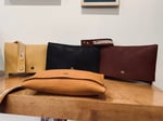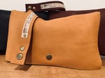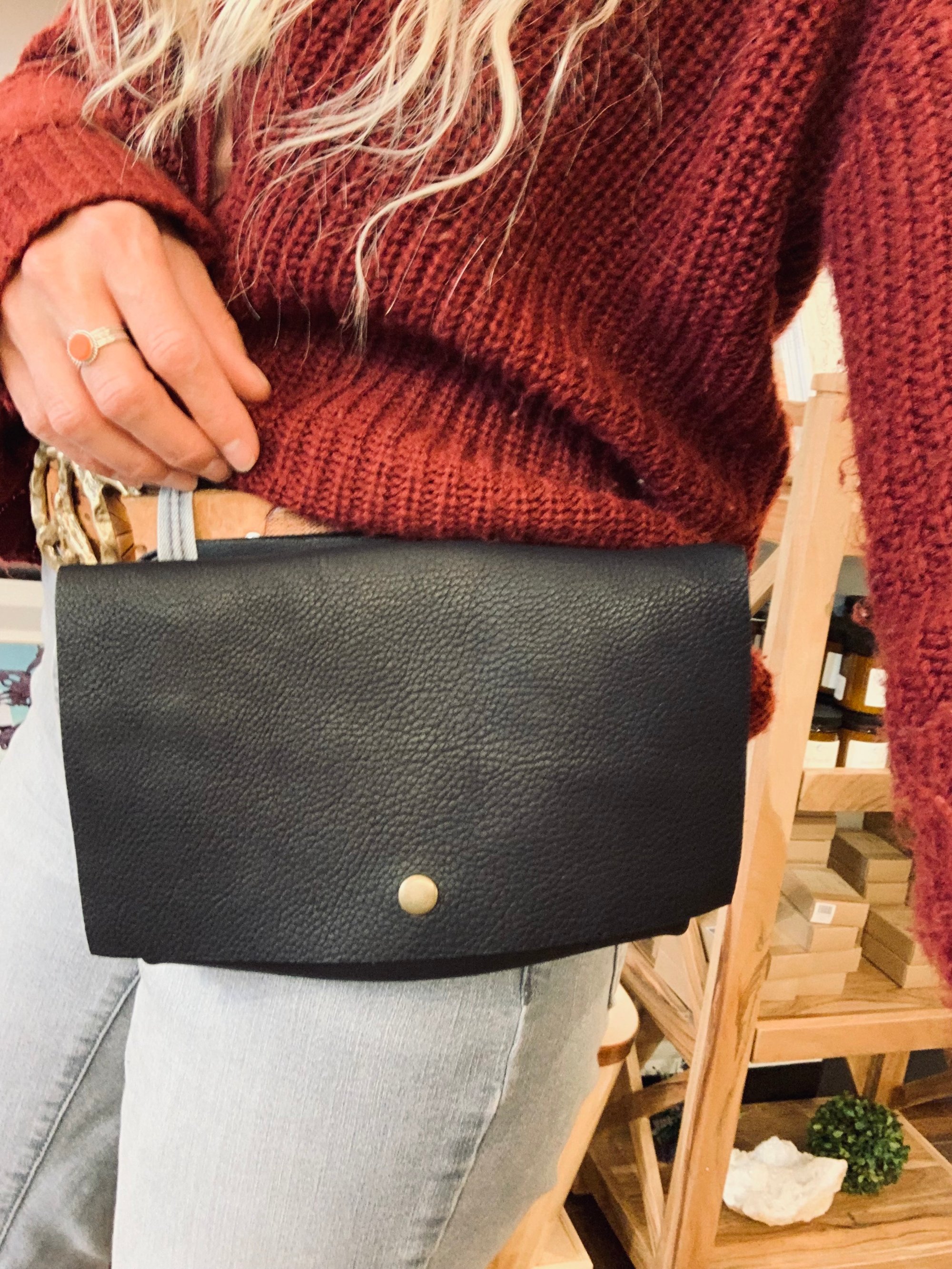 Genuine leather with a deerskin feel. Approx 8"x5". This clutch has room for all your essentials! Its super versatile and easily converts into a hands free hip wallet. 1" Wrist strap fits standard belt loops.